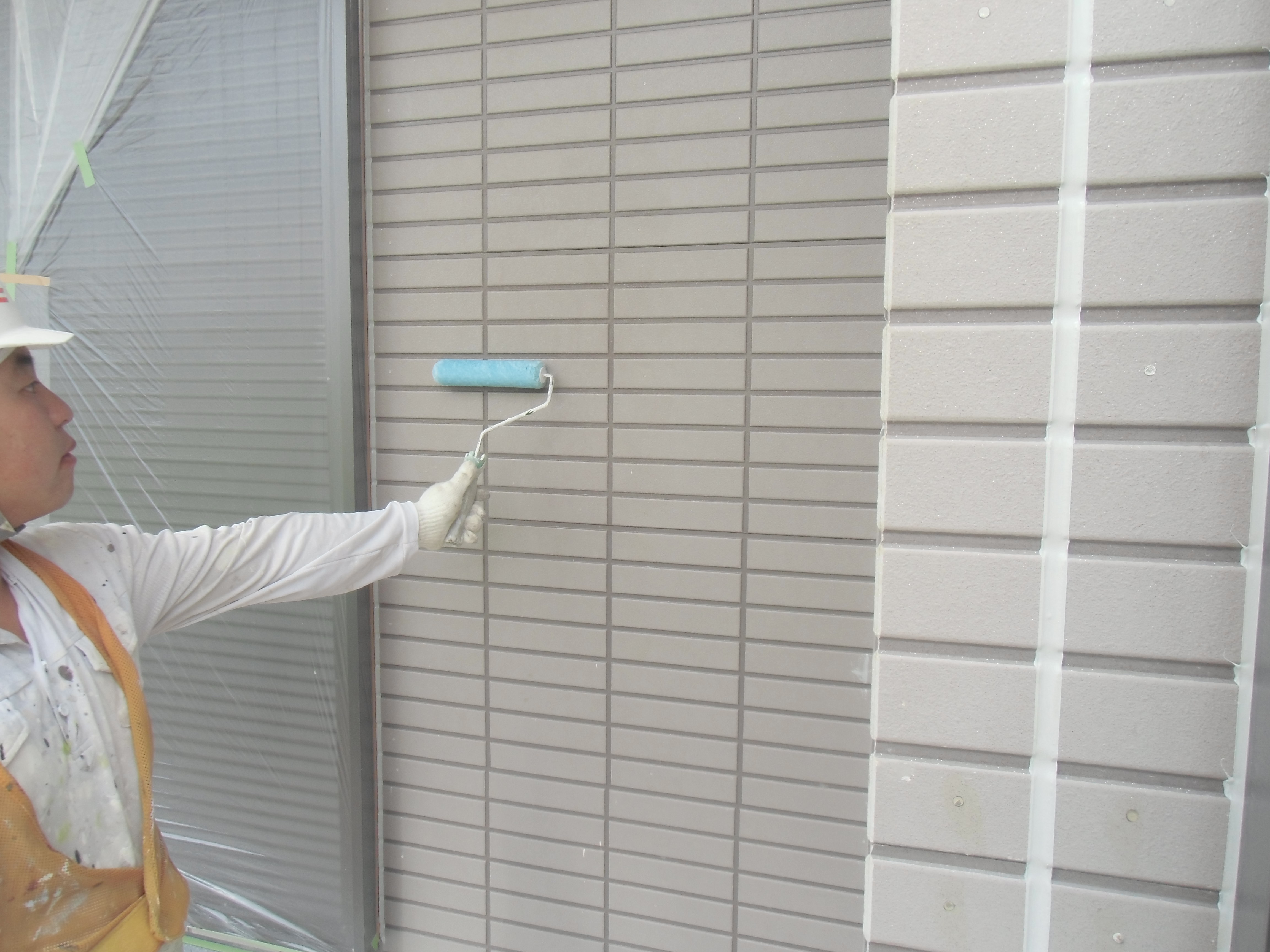 こちらの現場では下地がサイディングと言う事もありまして、お客様と打ち合わせ相談した結果、弱溶剤2液型シリコンで塗装することになりました。旧塗膜との密着を考え、下塗りで使用した塗料は弱溶剤2液型変性エポキシシーラーです。