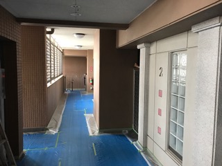通路の養生も破れにくいブルーシートを使用し作業しております。