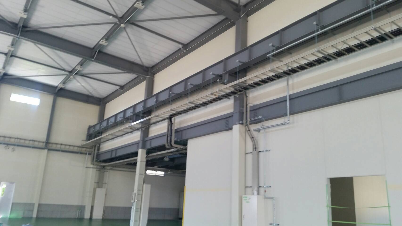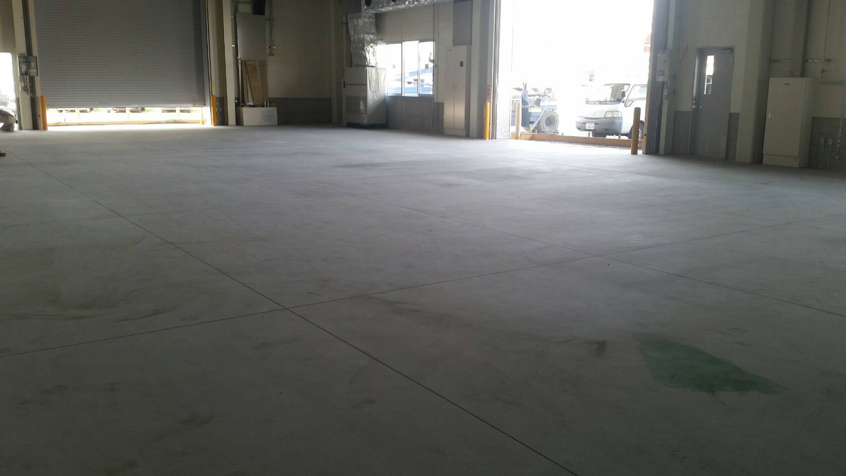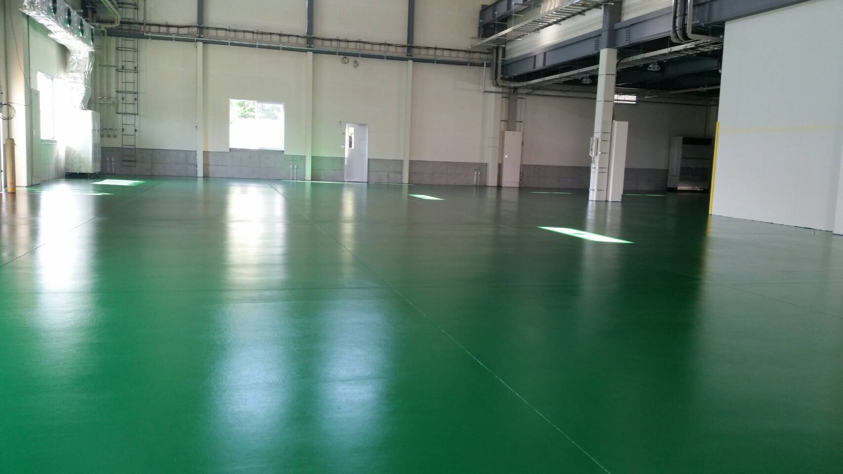 内部塗装工事はプラスターボードのパテ処理、上塗り、鉄骨塗装の上塗りが終わり、床塗装に入っております。
