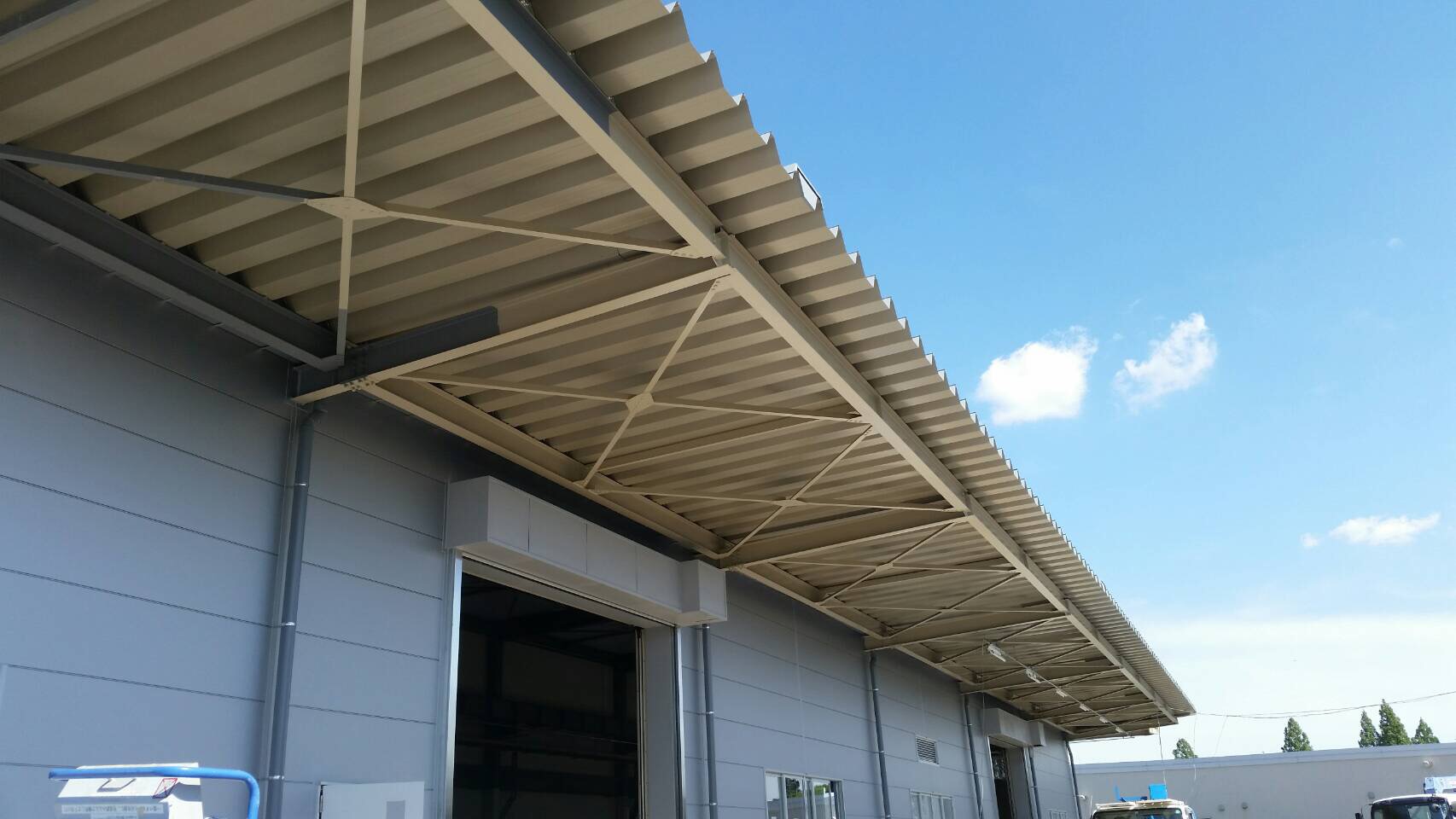 外部塗装工事は庇の鉄骨架台の上塗りの途中でございます。